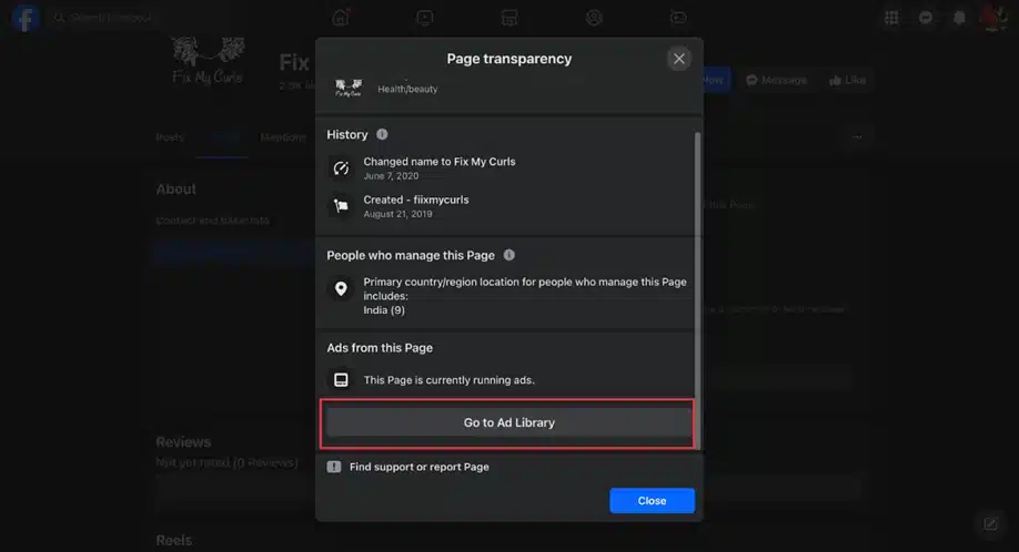 The second way is by looking at a specific brand’s Facebook Page. Every Page has a “Page Transparency” section, and from there you can view their ads directly inside the meta library. Here’s how to do it: