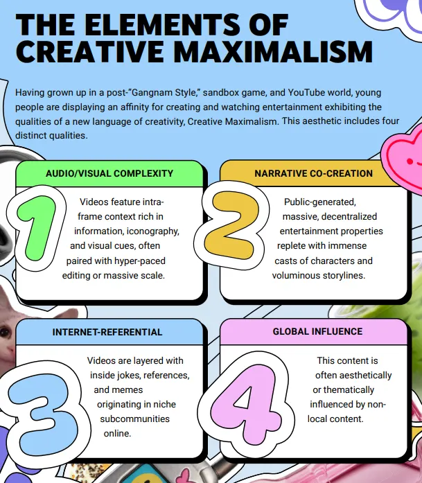 “As today’s young people continue to flex their creative and curatorial muscles, Creative Maximalism will become entrenched in pop culture. This transition is already underway with mainstream entities adopting and normalizing this new creative language. Brands like Nutter Butter are adopting the style for social media, and major players like the NFL are adapting it through schedule release videos. Even Hollywood is actively scouting YouTube franchises like ‘Skibidi Toilet.’”
