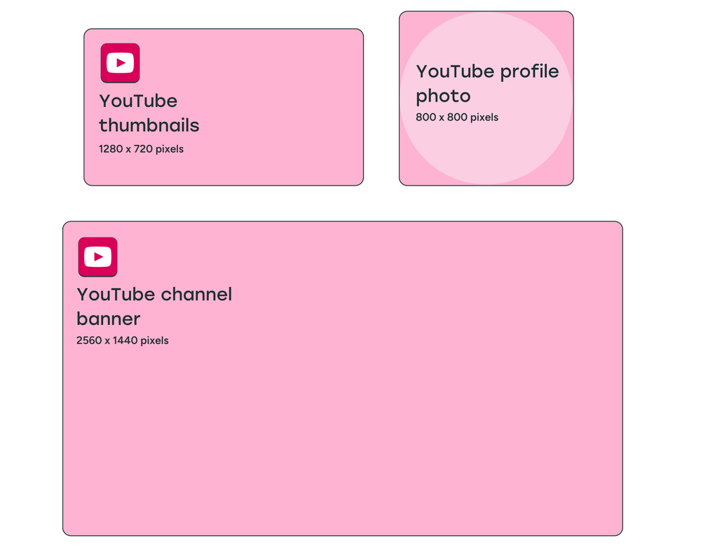 | YouTube image sizes | 800 x 800 pixels | 2560 x 1440 pixels | – | – | 1280 x 720 pixels | – |
