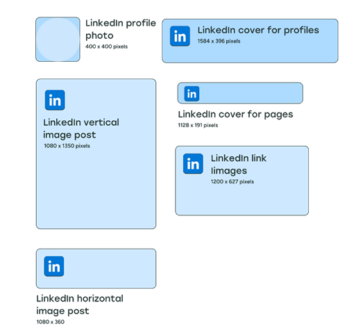 | LinkedIn image sizes | 400 x 400 pixels | Profiles: 1584 x 396 pixels Company pages: 1128 x 191 pixels | Vertical: 1080 x 1350 pixels Horizontal: 1080 x 360 pixels | – | – | 1200 x 627 pixels |